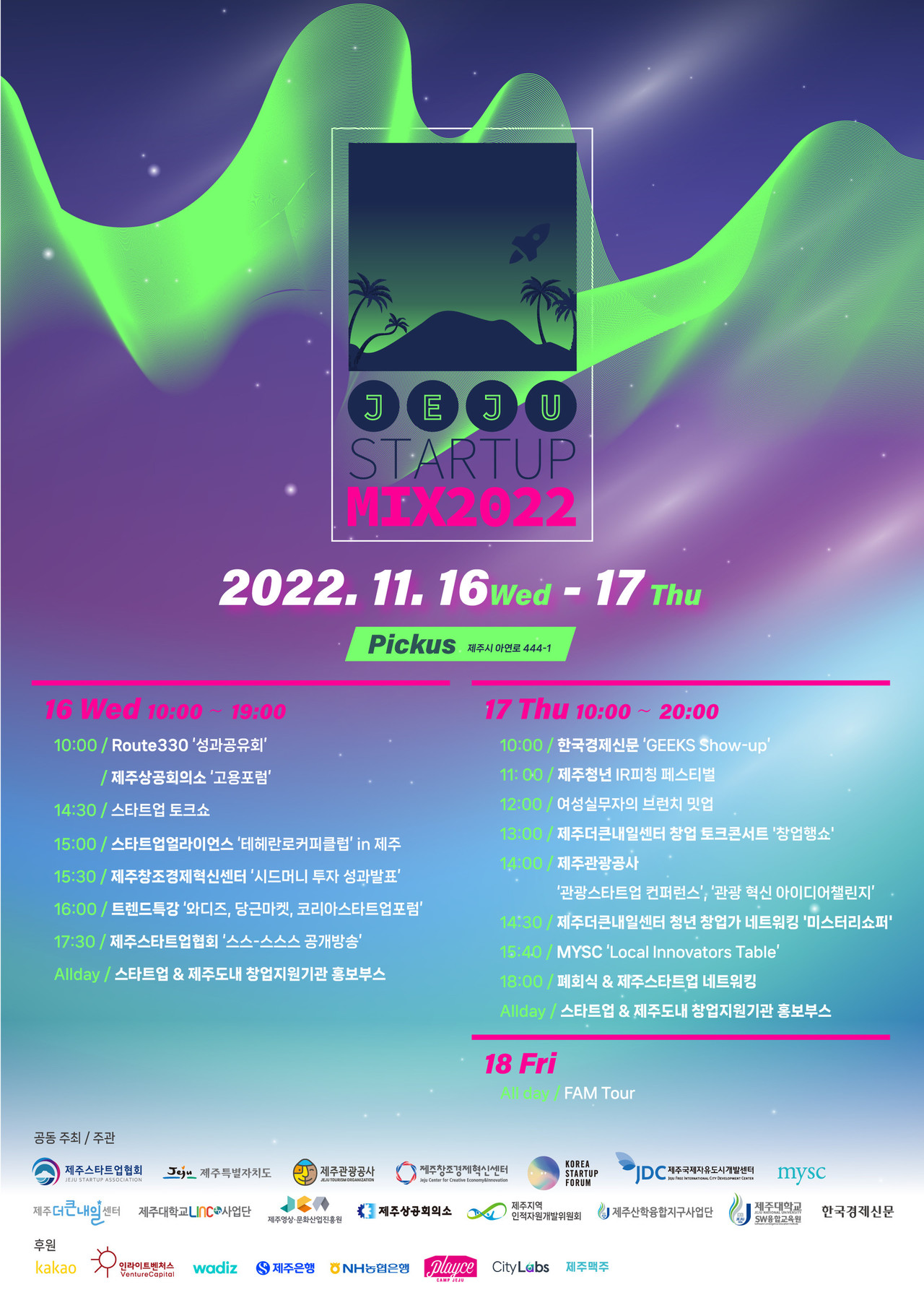 | 주최/주관 | 제주스타트업협회, 제주특별자치도, 제주관광공사, 제주창조경제혁신센터, 코리아스타트업포럼, 제주국제자유도시개발센터, 엠와이소셜컨퍼니,제주더큰내일센터, 제주LINC사업단, 제주영상문화산업진흥원, 제주상공회의소, 제주지역인적자원개발위원회, 제주산학융합지구사업단,제주대학교 SW융합교육원, |