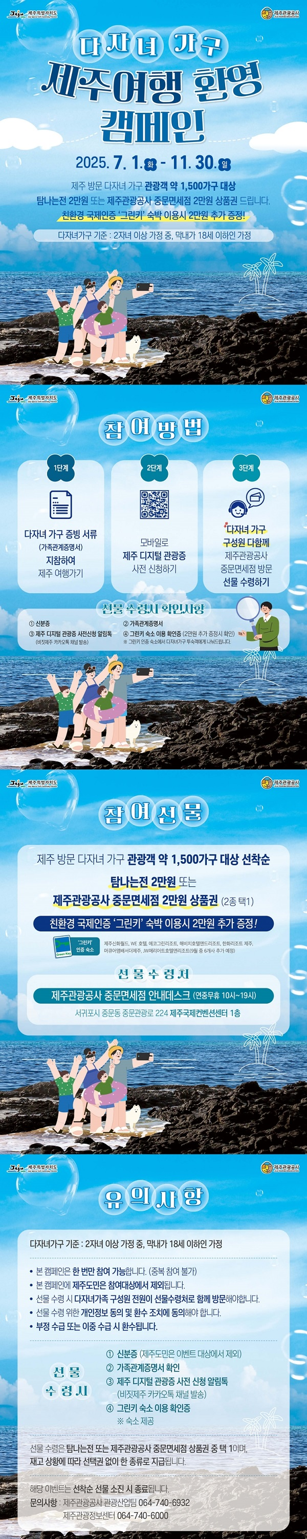 제주방문 다자녀 가구 관광객 약 1,500명 대상탐나는전 2만원 또는 제주관광공사 중문면세점 2만원 이용권을 드립니다!친환경 국제인증 `그린키` 숙박 이용시 2만원을 추가로 드리오니