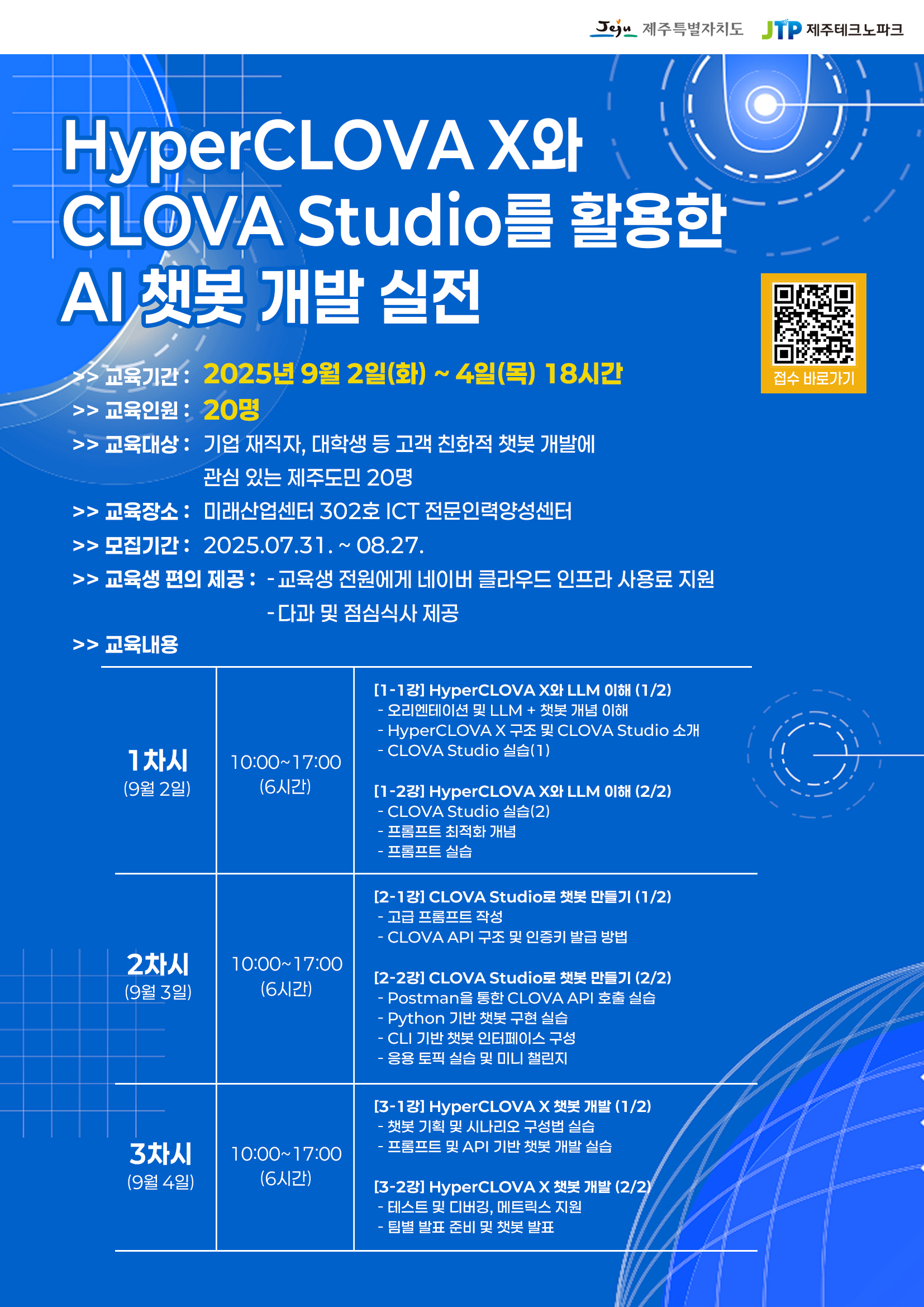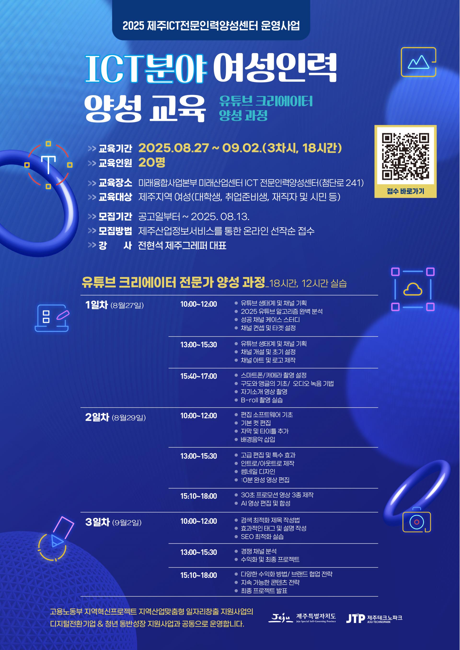 지원[제주테크노파크] ICT인력양성 교육에 많은 관심 부탁드립니다!(여성전문 인력양성교육, AI챗봇 교육)